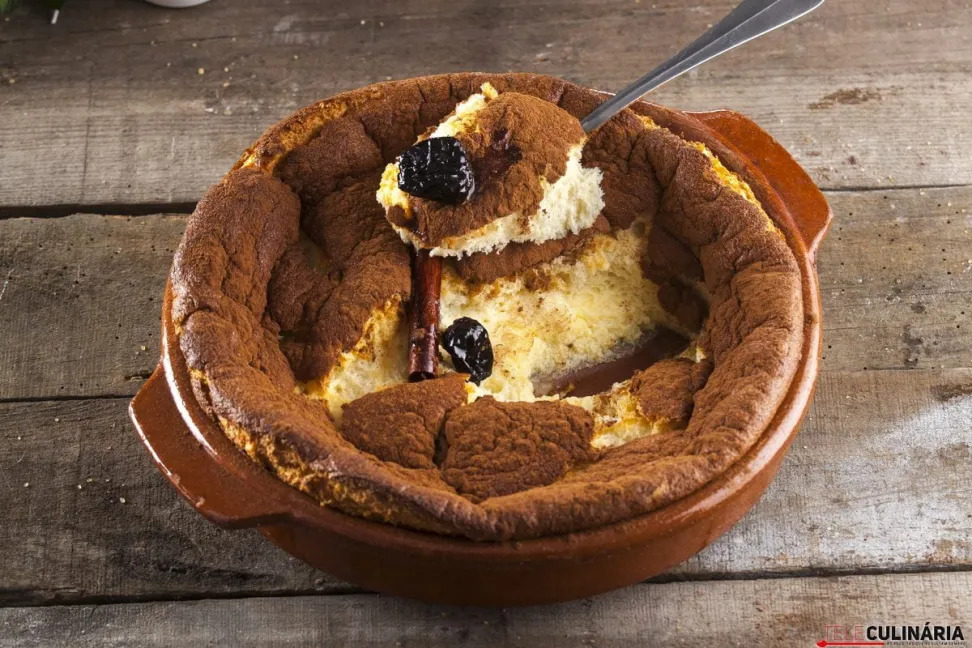 Запеченный заварной крем, пахнущий корицей и лимоном, с потрескавшейся, кратерообразной верхушкой — хороший признак того, что он хорошо поднялся. Скорее всего, его привезли из монастырских кухонь Алентежу, а затем он распространялся по воскресным семейным обедам. Сочетание с консервированными сливами сорта Элваш создаёт кисловатый контраст с насыщенным заварным кремом. Местные жители подают его щедрыми ложками, а не аккуратными ломтиками.