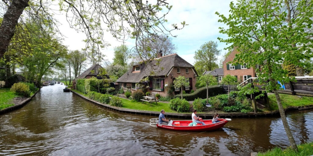 В Нидерландах есть место, где почти нет дорог, и все передвигаются на лодках: Гитхорн, часто называемый «Северной Венецией». Его дома с соломенными крышами соединены сетью каналов, по которым ходят небольшие лодки, создавая спокойную, сказочную атмосферу.