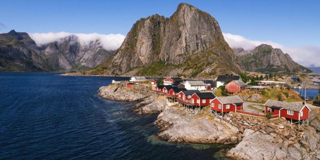 В самом сердце Лофотенских островов расположен Рейне, небольшая рыбацкая деревушка, окруженная зубчатыми горами, которые почти касаются моря. Пейзаж сразу же поражает: драматичный, величественный и завораживающий. Красные дома, традиционные рорбуэры, создают яркий контраст с глубокой синевой арктических вод.