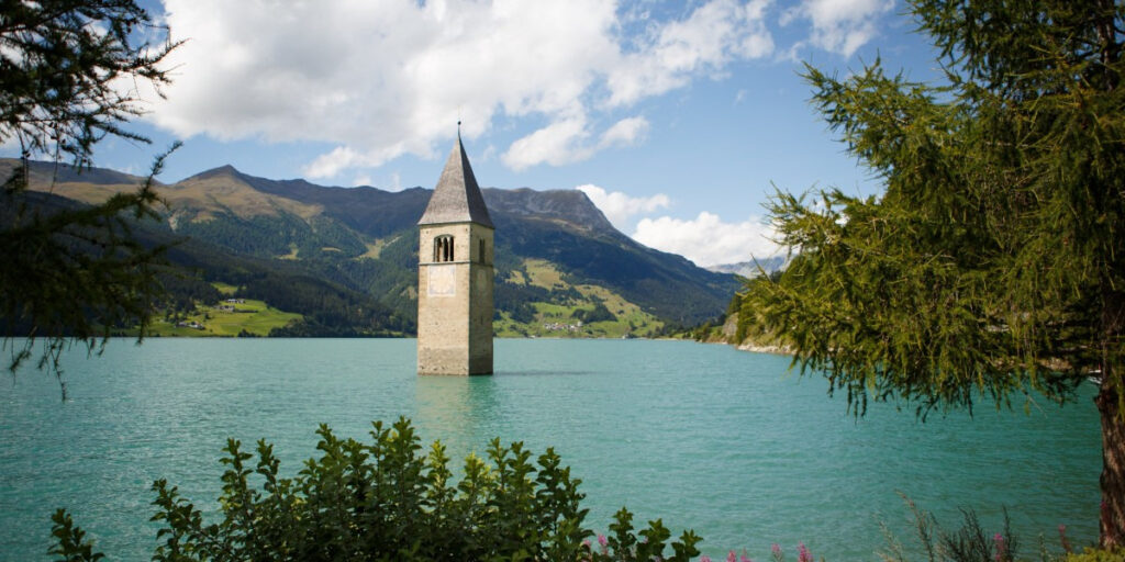 Знаменитая колокольня, возвышающаяся над водами озера Резия, — одно из самых впечатляющих и необычных мест Италии. Это единственный сохранившийся фрагмент древней деревни Курон в провинции Больцано, которая была затоплена в 1950-х годах после строительства плотины для гидроэлектростанции.