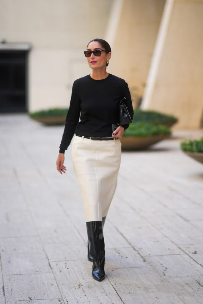 Высокие сапоги до колена могут преобразить любой образ, добавив пропорции одним простым движением. Нося их с платьями-свитерами, мини-юбками или поверх узких брюк, они создают лаконичный силуэт, который выглядит одновременно современно и вневременно. Наиболее универсальными являются нейтральные оттенки, такие как черный, коричневый и замша.