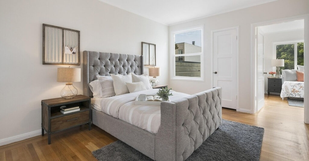 • Главная спальня: личный уголок, где сочетаются комфорт и стиль, требующий особого внимания. Кровать с ящиком для хранения позволяет хранить одеяла и пледы, освобождая место в шкафу. Наиболее подходящие оттенки — синий или шалфейно-зелёный, способствующие отдыху, в сочетании с мягким регулируемым освещением с помощью точечных светильников или настенных бра. Если позволяет площадь, изготовленные на заказ шкафы или гардеробная элегантно дополнят пространство.