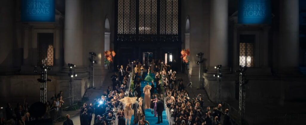 Трейлер нового фильма показывает нам кадры с красными каблуками Миранды, потом как она заходит в лифт и как вслед за ней забегает персонаж Хетеуей (Андреа). Далее они едут в лифте, стоя рядом.