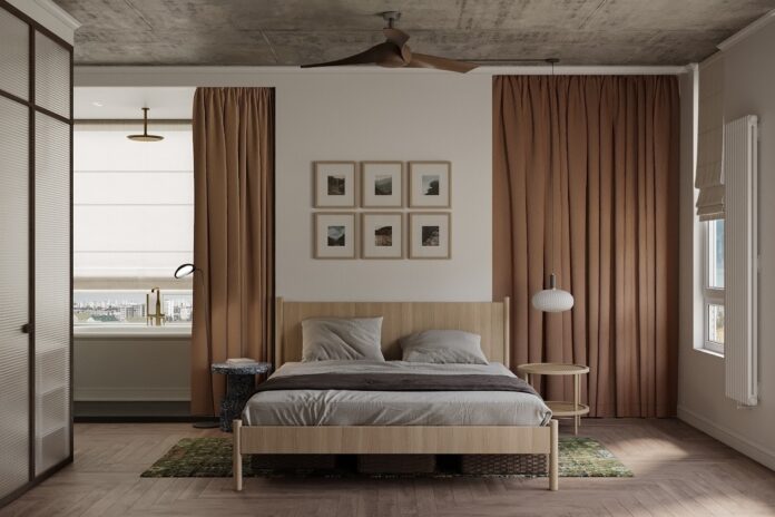 Приватную зону в виде спальни, санузла и гардеробной мы сделали более мягкой и уютной: здесь и много дерева, и элементы плетения из ротанга, и большое количество текстиля.