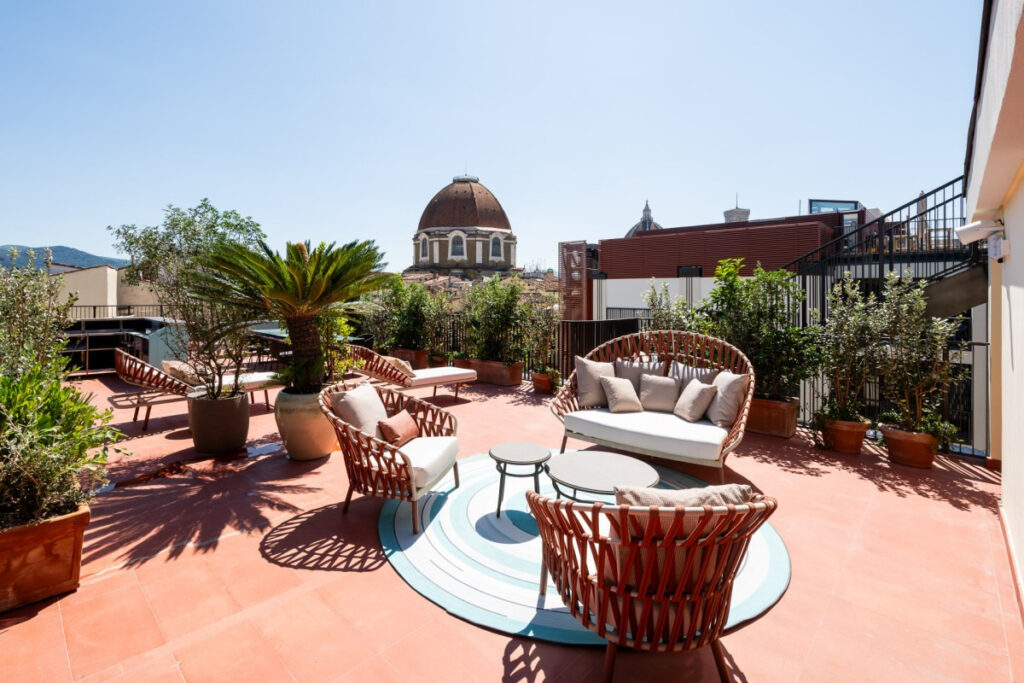 Номера отличаются изысканной элегантностью: роскошная мебель, традиционные материалы, переосмысленные в современном ключе, и цветовая палитра, вдохновленная городом. Большие окна и открытые пространства открывают уникальные виды на исторические крыши, а пентхаус располагает собственной террасой площадью 140 квадратных метров с видом на такие знаковые места, как дворец Питти и коридор Вазари .