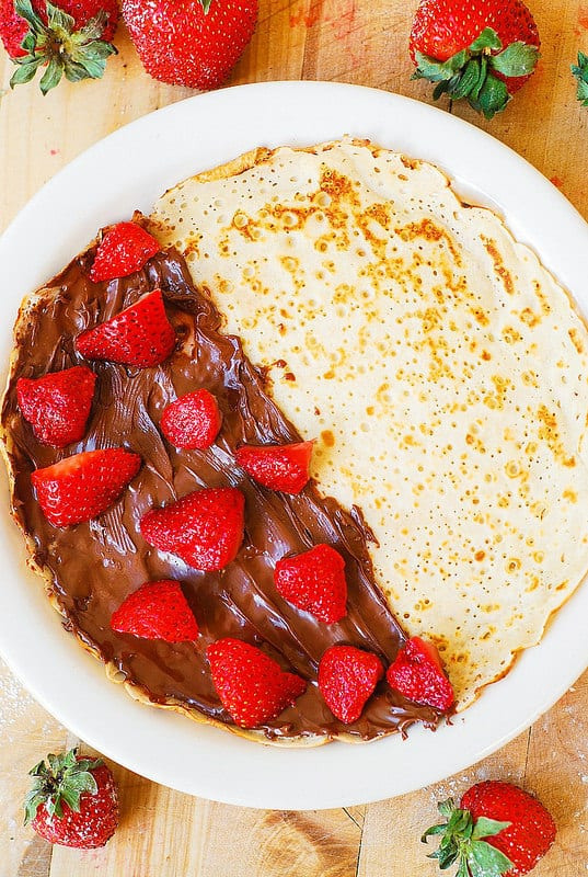- Распределите шоколадно-ореховую пасту по половине блина.