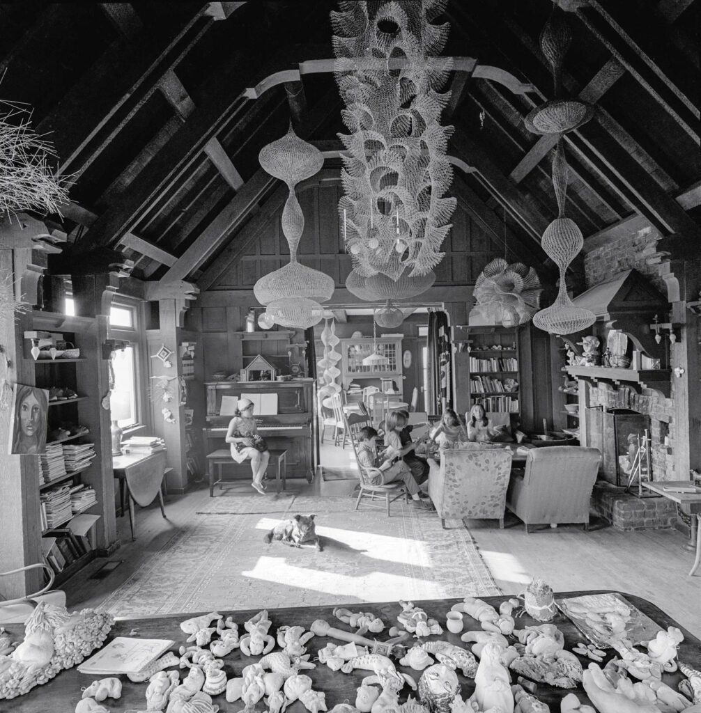 На всех семейных фотографиях Рут Асава рисует или плетет нити, создавая свои скульптуры. На одной из них она изображена с четырьмя из шести своих детей. Дети по-своему устраивают беспорядок: одни стоят на столе, другие пытаются поднять бутылочки, намекая, что их содержимое скоро прольется на пол, а она, игнорируя их, продолжает плести нити.