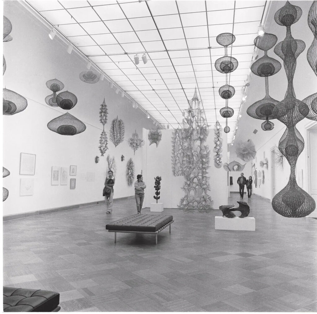 Рут Асава (вторая слева) с посетителями своей выставки  «Рут Асава: ретроспектива», Музей искусств Сан-Франциско (ныне SFMOMA), 1973 год; © 2026 Ruth Asawa Lanier, Inc., любезно предоставлено David Zwirner; фото: Лоуренс Кунео