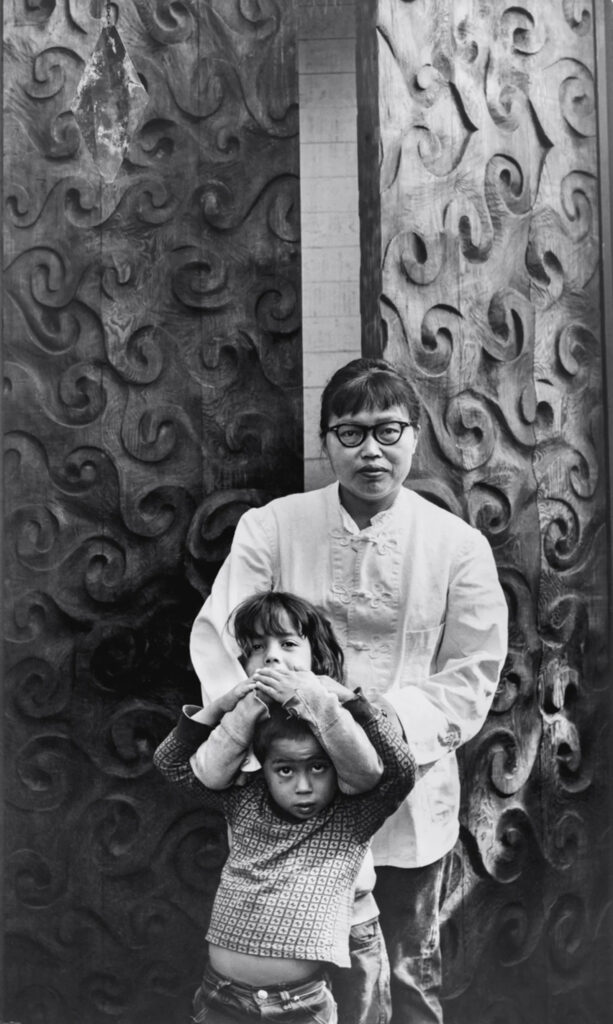 резными дверями из красного дерева (S.528, двери из красного дерева для дома Рут Асавы) в своем доме в Сан-Франциско, около 1965 года; фото: Джоан Пирсон Уоткинс; © 2026 Ruth Asawa Lanier, Inc., любезно предоставлено David Zwirner