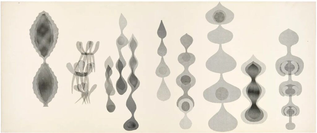 Без названия (ZP.16B, Двенадцать скульптурных форм из проволоки в петлях), середина-конец 1950-х годов; растровая печать на картоне; 25,4 x 61 см; частные коллекции; © 2026 Ruth Asawa Lanier, Inc., любезно предоставлено David Zwirner; фото: James Paonessa
