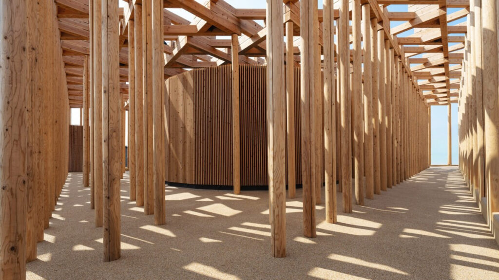 Каждая из этих колонн на верхнем уровне оснащена NFC-метками, которые позволяют посетителям узнать информацию о месте, откуда была привезена древесина, тем самым способствуя установлению прямой связи между природой, технологиями и культурой.