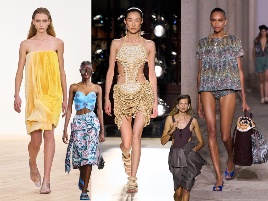 Дизайнеры полностью погрузились в пляжную жизнь летом 2026 года, включив в свои коллекции явные отсылки к плаванию и серфингу. Модели Chloé демонстрировали купальники с драпированными кожаными юбками, а дизайнер Rabanne Жюльен Доссена заявил, что вдохновился своим детством на побережье, что отразилось в деталях и тканях, вдохновленных дайвингом. В Missoni модели носили пляжные полотенца в сумках, словно всегда готовые к быстрому купанию, а в Loewe и Balmain полотенца, похоже, были использованы в виде платьев без бретелей. Коллекция последнего была посвящена пляжу, а некоторые модели были почти полностью изготовлены из морских ракушек.