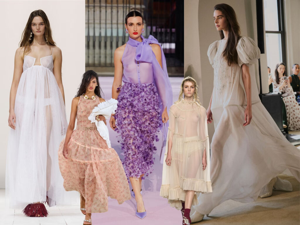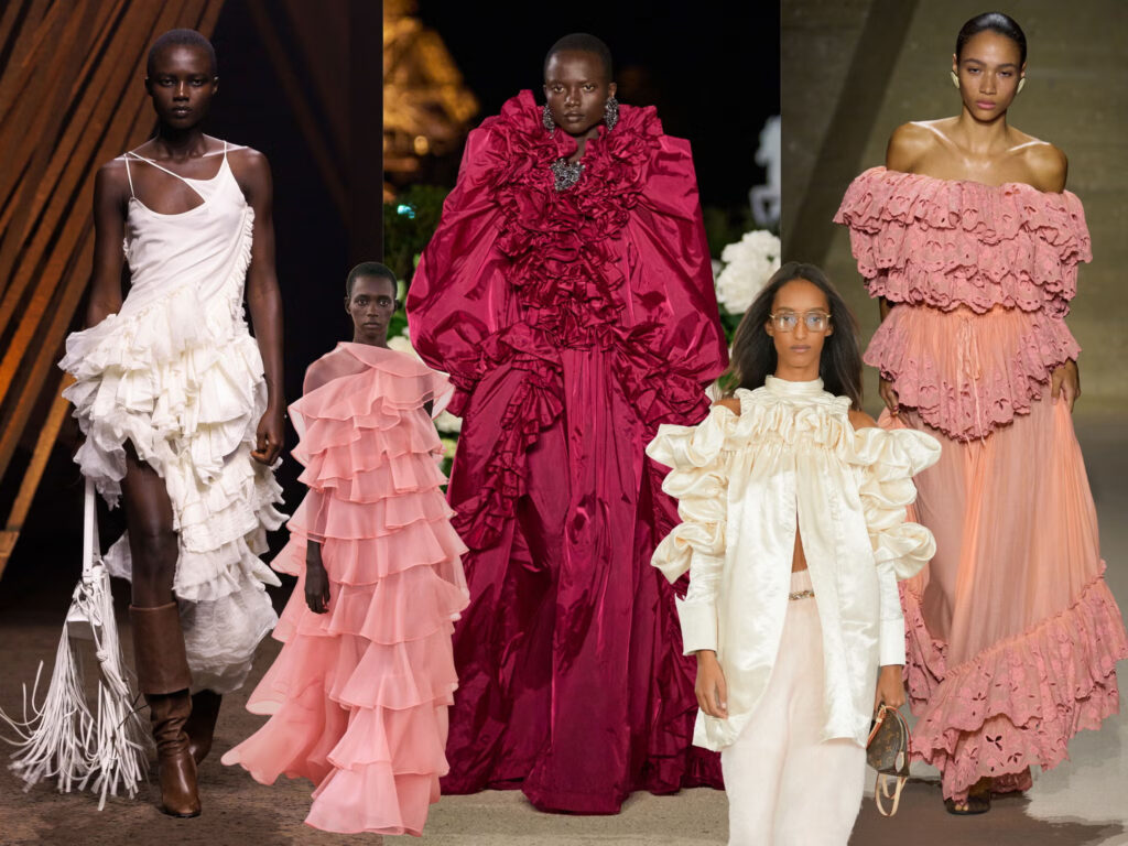Весной мода во многом продемонстрировала более мягкую сторону, добавив романтические элементы, призванные отвлечь от суровых реалий мира. Это особенно ярко проявилось в любви дизайнеров к оборкам: кружевные в коллекции Chloé, шелковые дополнения к жакетам Louis Vuitton и прозрачные платья Givenchy. Марджела, Маккуин, Каролина Эррера, Скьяпарелли и Джамбаттиста Валли также отдали предпочтение оборкам, но наиболее эффектный (и запоминающийся) образ представил Сен-Лоран, создавший струящиеся платья (по мотивам «Прустовских» платьев Ива Сен-Лорана 1970-х годов), достойные любой современной героини.