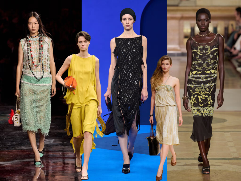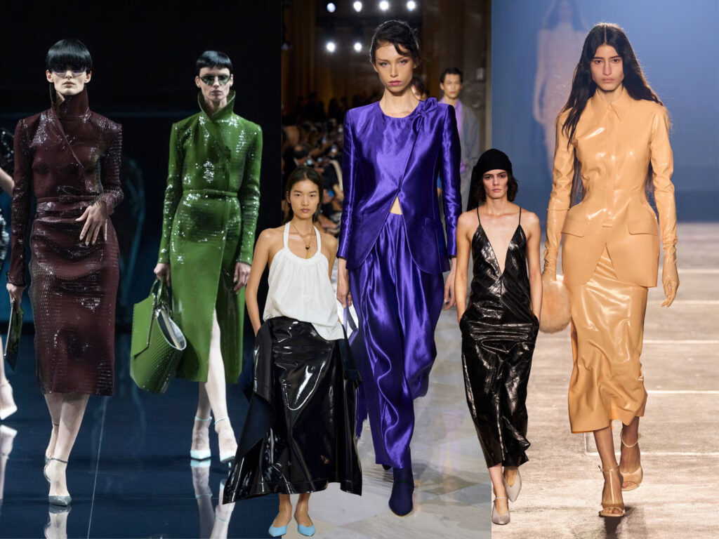 Виниловые платья, струящийся шелк, мягкий латекс и вкрапления пайеток придавали многим весенне-летним коллекциям блестящий вид. Юбки Carven, облегающие платья-футляры Ferragamo и рубашки-«песочные часы» Mugler буквально отражали свет, в то время как Giorgio Armani представил переливающиеся комплекты роскошных цветов, а пайетки Tom Ford сверкали на подиуме.