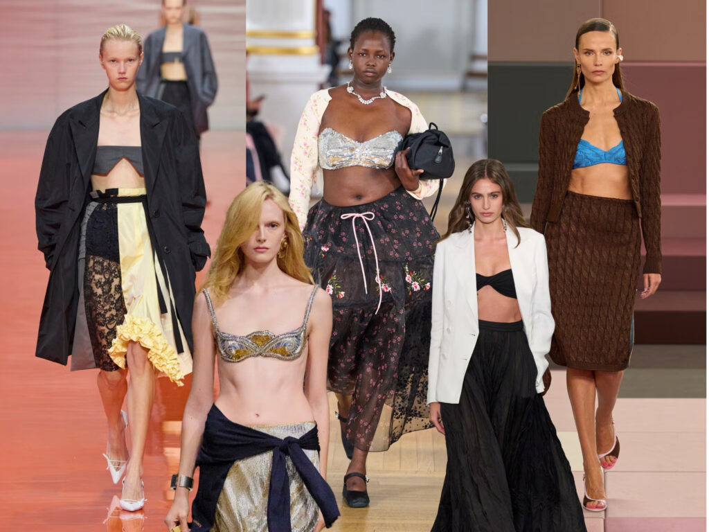 Похоже, ваш бюстгальтер — ваш лучший друг весной. По крайней мере, если он на виду. На показе Chanel можно было увидеть милые розовые бюстгальтеры в винтажном стиле под прозрачными топами, а крошечные расшитые бисером бюстгальтеры Versace смело носили с облегающими юбками. Fendi, Ralph Lauren и Prada выбрали более откровенный подход, надевая их под приталенные жакеты и объемные блейзеры. Симона Роша создала интересный контраст, сочетая свои бюстгальтеры-бандо с пайетками с цветочными кардиганами и театральными юбками-кринолинами из органзы.
