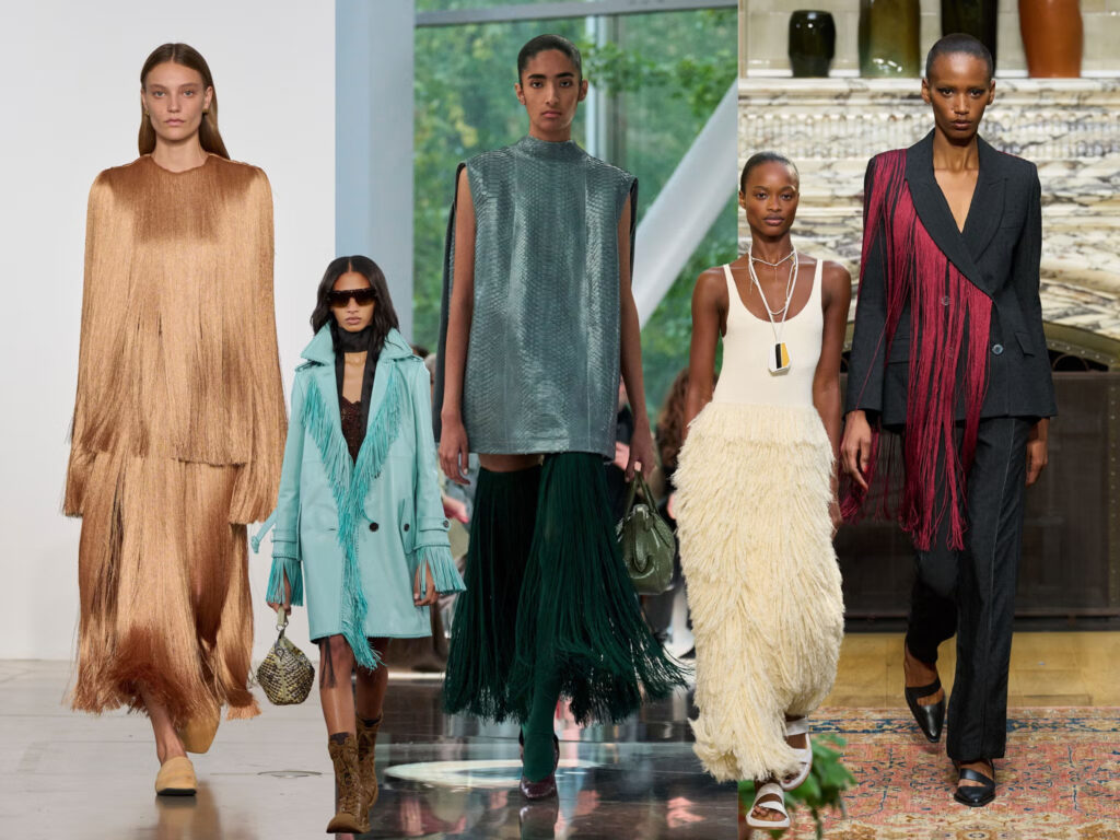 Максималисты, ликуйте, бахрома вот-вот станет обычным явлением. Алувалия добавила эффектные красные пряди к простому двубортному блейзеру, Burberry — к ярко-синему тренчу, а Bottega — к очень длинным шарфам. В других местах показ стал еще более театральным у Габриэлы Херст, чьи свежие белые летние платья имели чрезмерно бахромчатые длинные юбки, а шелковый костюм от Calvin Klein стал изюминкой коллекции. Алайя, однако, превзошла всех цветными чулками от Питера Мюльера, дополненными длинной развевающейся бахромой, которая начиналась от середины бедра и ниспадала вниз по ногам.