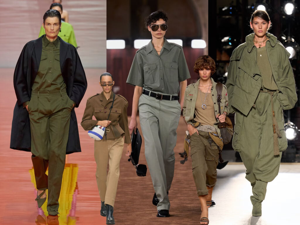 На противоположной стороне роскоши, вдохновленной XVIII веком, дизайнеры представили новый вид униформы на следующий сезон. Prada, в частности, размышляла о том, что означает «униформа» сегодня, предлагая рабочие комбинезоны с элегантными аксессуарами и неожиданными деталями. Но функциональная одежда цвета хаки встречалась и в других местах: рубашки-карго от Acne с брюками с поясом придавали образу андрогинный оттенок, а военные куртки с баской от Celine сочетались с прямыми брюками и ковбойскими сапогами. Цвета хаки также присутствовали у Chloé и Dior, в то время как Balmain и Isabel Marant выбрали несколько более богемный подход с объемными вещами и укороченными брюками-карго.
